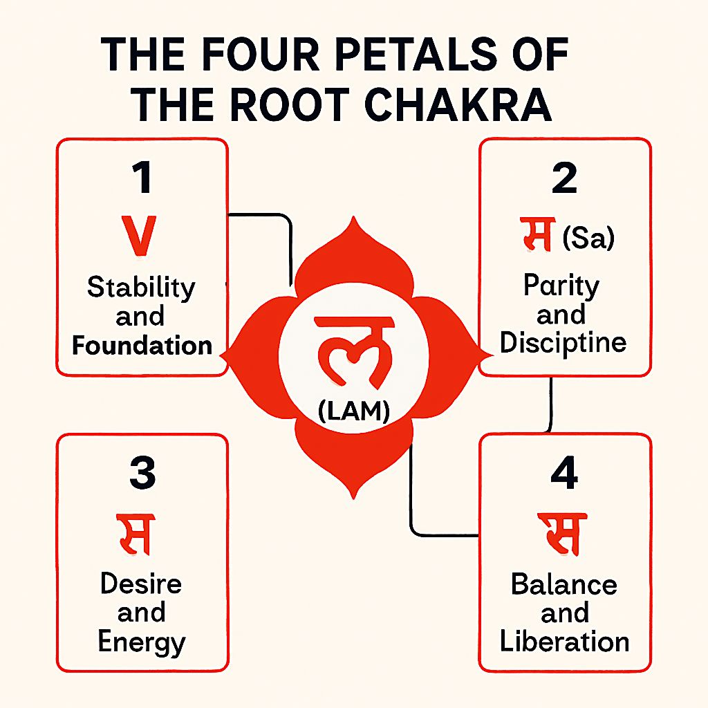 मूलाधार चक्र की 4 पंखुड़ियां होती है. इन चार पंखुड़ियों पर होती है 4 शक्तियां. इन शक्तियों में इतना आकर्षण होता है कि हमारी इन्द्रियों को इस संसार की ओर आकर्षित किए रखती है. संसार के जितने भी आकर्षणों के प्रति हम आकर्षित होते है उनके पीछे मूलाधार चक्र की शक्तियां काम कर रही होती है. कभी एक शक्ति तो कभी एक से अधिक शक्तियां हमारी सभी इच्छाओं के पीछे काम कर रही होती है.